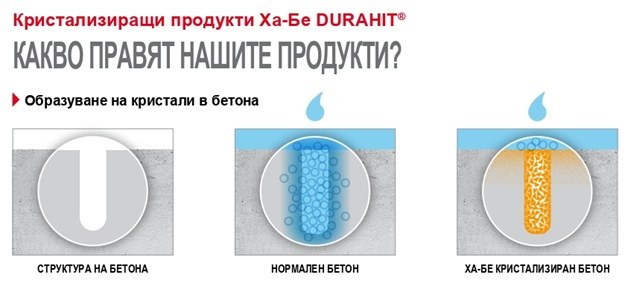 Кристализиращите добавки за бетон на Ха-Бе България са висококачествени сертифицирани добавки за кристализиращa хидроизолация с търговкса марка DURAHIT®. Тъй като реакциите протичат вътре в матрицата на бетона, продуктите DURAHIT® стават неразделна част от бетонната маса и по този начин не могат да бъдат премахнати или износени по-късно.